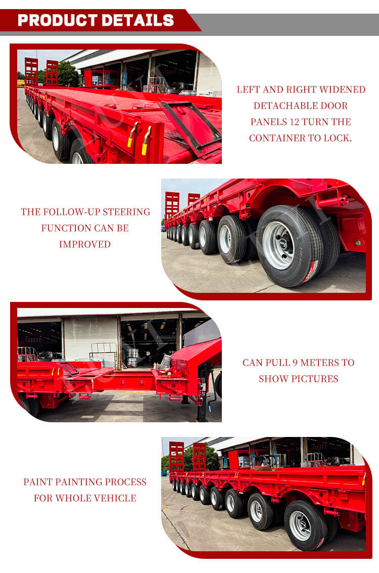 รถพ่วงมาพร้อมกับการออกแบบเสริมแรง 10 เพลาและจับคู่กับระบบกันสะเทือนแบบถุงลมหรือแหนบ ทำให้รถพ่วงมีความเสถียรในการขับขี่ที่โดดเด่น โครงสร้างคอห่านคงที่ช่วยให้มั่นใจในการยึดเกาะที่เชื่อถือได้ ในขณะที่บันไดไฮดรอลิกหรือแบบแมนนวลช่วยอำนวยความสะดวกในการขนถ่ายสินค้า มาพร้อมกับอุปกรณ์ลงจอดขนาด 28 ตันเป็นมาตรฐานเพื่อการรองรับที่มั่นคงและทนทาน และสามารถปรับแต่งสีได้ตามต้องการ ด้วยการออกแบบโครงสร้างที่ยอดเยี่ยมและการควบคุมคุณภาพที่เข้มงวด จึงเหมาะสำหรับการขนส่งสินค้าหนัก เช่น อุปกรณ์ขนาดใหญ่และส่วนประกอบทางวิศวกรรม ซึ่งเป็นโซลูชั่นที่มีประสิทธิภาพและปลอดภัยสำหรับอุตสาหกรรมโลจิสติกส์และการขนส่ง