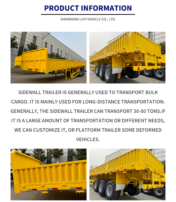 LUYI 13m 3-Axle Semi-Trailer Steel-Aluminium Stake Trailer มีพื้นเพมาจากมณฑลซานตงประเทศจีนเป็นรถกึ่งพ่วงผนังด้านข้างใหม่ล่าสุดออกแบบมาเป็นพิเศษสำหรับการขนส่งสินค้าทางรถบรรทุก รถพ่วงผลิตจากเหล็กคุณภาพสูง มีความสมดุลระหว่างความแข็งแรงของโครงสร้างและความทนทาน โดยสามารถรับน้ำหนักบรรทุกได้สูงสุด 20,001-25,000 กิโลกรัม ตอบสนองความต้องการในการขนส่งสินค้าขนาดกลางและงานหนักได้อย่างง่ายดาย