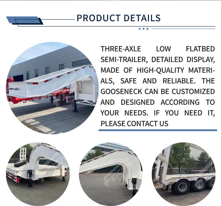 ผลิตจากเหล็กคุณภาพสูง มีขนาด 17000×3000×1500 มม. ทำให้มีพื้นที่เพียงพอสำหรับบรรทุกสินค้า มีเพลา 4 เพลาสำหรับการรับน้ำหนักที่แข็งแกร่ง พร้อมตัวเลือกระบบกันสะเทือนแบบลมหรือแหนบเพื่อรับประกันการขับขี่ที่มั่นคงและการปกป้องสินค้าที่มีประสิทธิภาพ การออกแบบคอห่านแบบถอดได้ช่วยเพิ่มความยืดหยุ่นในการบรรทุก ในขณะที่ตัวเลือกบันไดแบบไฮดรอลิกหรือแบบแมนนวลช่วยให้การขนถ่ายอุปกรณ์หนักทำได้ง่ายขึ้น
