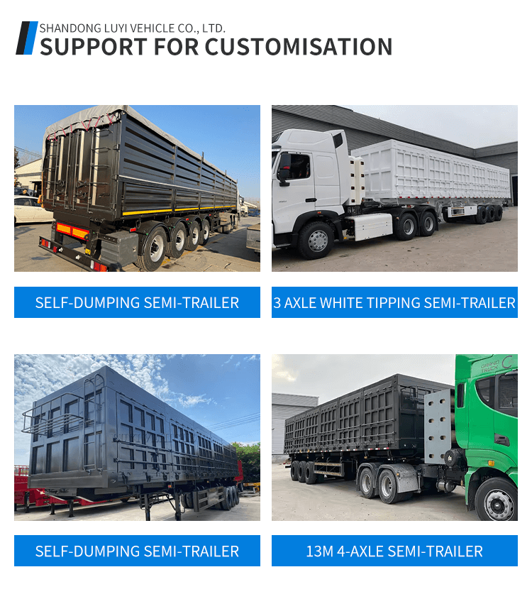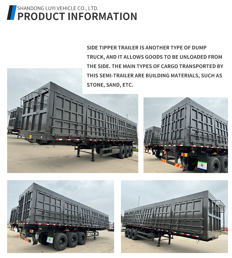 รถกึ่งพ่วงดั๊มปลายข้าง 3 เพลา 40 ตันจาก LUYI เป็นโซลูชั่นประสิทธิภาพสูงสำหรับการขนส่งงานหนัก มีต้นกำเนิดจากซานตง ประเทศจีน มีโครงสร้างใหม่เอี่ยมด้วยเหล็กกล้าระดับพรีเมียม จึงมั่นใจได้ถึงความทนทานเพื่อทนต่อสภาพการขนส่งที่ยากลำบาก