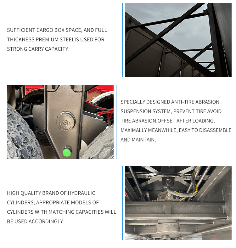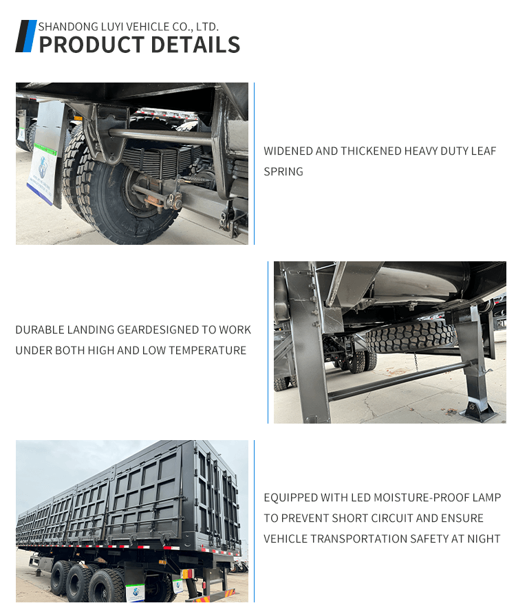 ด้วยขนาด 11000x2500x3500 มม. และน้ำหนักบรรทุกสูงสุด 25,001-30,000 กก. จึงตอบสนองความต้องการในการบรรทุกหนักได้อย่างมีประสิทธิภาพ ติดตั้งระบบกันสะเทือนแบบกลไก แหนบสปริง 90(W)mm×13(Thickness)mm×10(Layer) และระบบเบรกแบบสองแถวเพื่อการทำงานที่มั่นคงและปลอดภัย อุปกรณ์ลงจอดมาตรฐาน 28Ton และพินคิง JOST ขนาด 2 "(50 มม.) / 3.5" (90 มม.) ช่วยเพิ่มความสามารถในการปรับตัว สามารถปรับแต่งสีและโลโก้ได้ ทำให้เป็นตัวเลือกที่หลากหลายและเชื่อถือได้สำหรับความต้องการด้านการขนส่งสินค้าหนัก