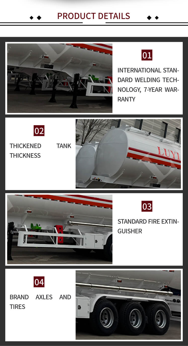 มีต้นกำเนิดจากมณฑลซานตง ประเทศจีน รถกึ่งพ่วงบรรทุกน้ำมันเหล็กกล้าคาร์บอน Luyi 3 เพลา 45,000 ลิตรเป็นรถพ่วงบรรทุกประสิทธิภาพสูงที่ออกแบบมาสำหรับการขนส่งของเหลว เช่น ดีเซล น้ำมันเบนซิน ปิโตรเลียม และน้ำมันดิบ ปริมาตรของมันสามารถอยู่ในช่วงตั้งแต่ 35,000 ลิตรถึง 50,000 ลิตรอย่างยืดหยุ่น ปรับให้เข้ากับสถานการณ์การขนส่งที่หลากหลาย