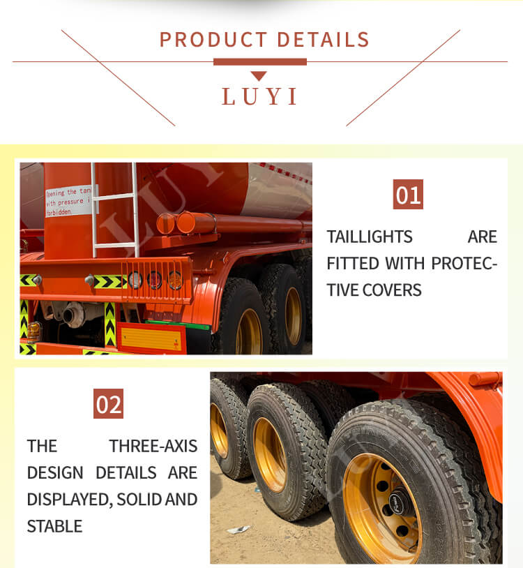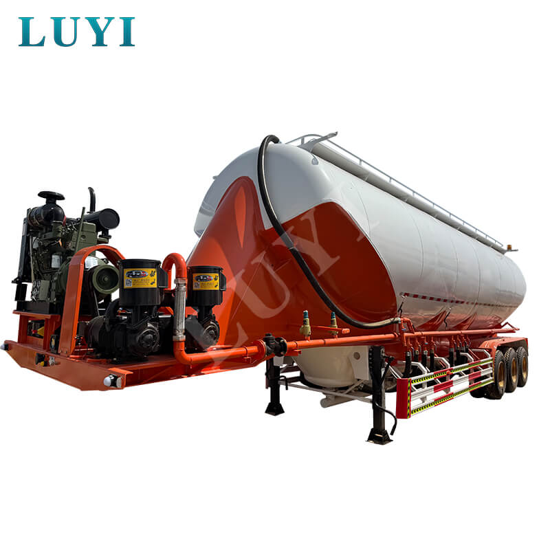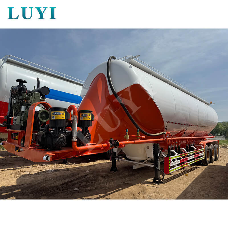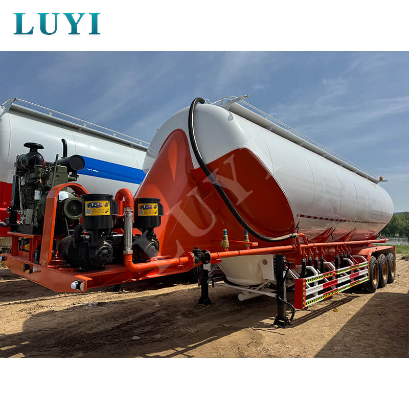 LUYI 3-Axle 50-Ton V-Type Cement Tanker Semi-Trailer มีต้นกำเนิดจากมณฑลซานตง ประเทศจีน เป็นรถกึ่งพ่วงรถบรรทุกประสิทธิภาพสูงออกแบบมาเป็นพิเศษสำหรับการขนส่งผงปูนซีเมนต์จำนวนมากหรือที่เรียกว่ารถบรรทุกถังผง ซึ่งตอบสนองความต้องการของสถานการณ์การขนส่งสินค้าได้อย่างแม่นยำ