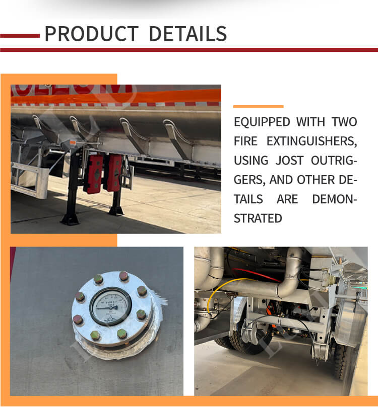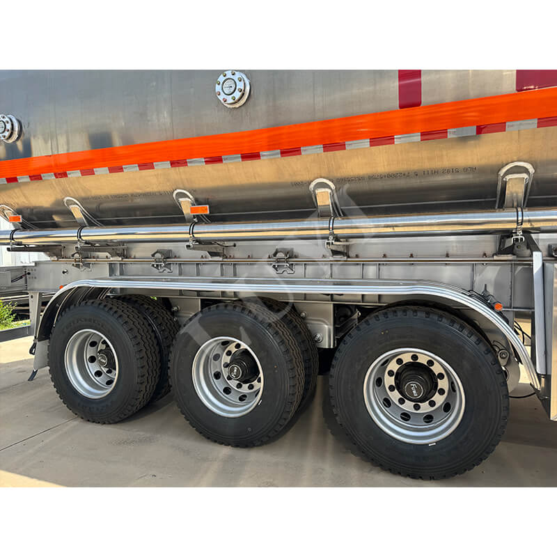 รถกึ่งพ่วงคันนี้ติดตั้ง LUYI 4 เพลา และระบบกันสะเทือนมีตัวเลือกระบบกันสะเทือนแบบกลไกหรือระบบกันสะเทือนแบบถุงลม เมื่อจับคู่กับยาง 12R22.5 ช่วยให้มั่นใจในการขับขี่ที่มั่นคงและเชื่อถือได้ ขารองรับเป็นรุ่นมาตรฐานที่มีน้ำหนัก 28 ตัน และหมุดหลักมีจำหน่ายในขนาด 2 นิ้ว (50 มม.) หรือ 3.5 นิ้ว (90 มม.) ซึ่งให้ความสามารถในการปรับตัวที่แข็งแกร่ง สีของมันสามารถปรับแต่งได้ตามความต้องการของลูกค้า ผสมผสานการใช้งานจริงและความเป็นส่วนตัว ทำให้เป็นตัวเลือกที่เหมาะสมที่สุดในด้านการขนส่งน้ำมันเชื้อเพลิง