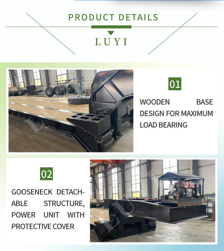 ผลิตโดย Luyi Vehicle ในซานตง ประเทศจีน รถกึ่งพ่วงพื้นต่ำคอห่านแบบ 3 เพลาแบบถอดได้ ถือเป็นโซลูชันการขนส่งสำหรับงานหนักที่เชื่อถือได้โดยมีน้ำหนักบรรทุกสูงสุด 100 ตัน มีขนาด 15,000×3000×1800 มม. เหมาะอย่างยิ่งกับความต้องการใช้งานรถพ่วงบรรทุก