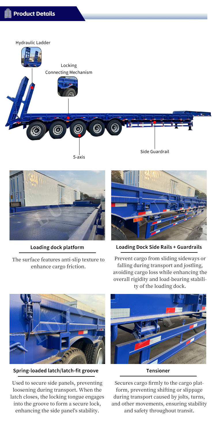 มีต้นกำเนิดจากมณฑลซานตง ประเทศจีน รถกึ่งพ่วงพื้นต่ำสำหรับงานหนัก Luyi 5 เพลา 80 ตันเป็นรถพ่วงรถบรรทุกที่แข็งแกร่งซึ่งออกแบบมาเพื่อการขนส่งที่บรรทุกหนัก สร้างด้วยเหล็กคุณภาพสูง โดยมีขนาด 130003000178 มม. และความสามารถในการรับน้ำหนักสูงสุด 80,000 กก. เหมาะสำหรับการลากอุปกรณ์หนักต่างๆ ได้อย่างง่ายดาย