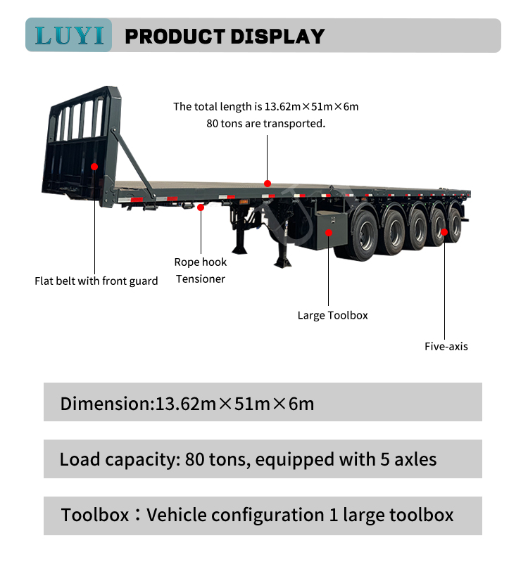 รถกึ่งพ่วงพื้นเรียบน้ำหนักเบา LUYI 5 เพลาที่มีต้นกำเนิดจากมณฑลซานตง ประเทศจีน ซึ่งเป็นฐานการผลิตระดับพรีเมี่ยม ได้รับการออกแบบมาเพื่อการขนส่งวัสดุก่อสร้าง โดยทำหน้าที่เป็นพันธมิตรที่เชื่อถือได้ในภาคโลจิสติกส์ทางวิศวกรรม รถพ่วงผลิตจากเหล็กกล้าคาร์บอนคุณภาพสูง มีความสมดุลระหว่างการออกแบบที่มีน้ำหนักเบาพร้อมกับการใช้พลังงานในการขนส่งที่ลดความแข็งแกร่งของโครงสร้าง ขณะเดียวกันก็รับน้ำหนักบรรทุกได้ 40 ตันอย่างปลอดภัย ตอบสนองความต้องการในการขนส่งวัสดุก่อสร้างต่างๆ ในระยะยาวได้อย่างง่ายดาย รวมถึงหิน เหล็ก และส่วนประกอบสำเร็จรูป