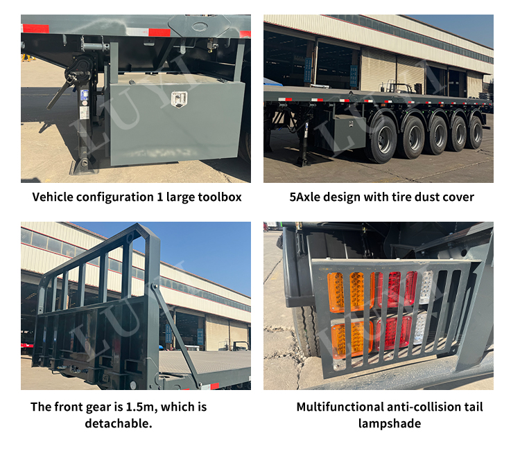 สีตัวเครื่องรองรับการปรับแต่งส่วนบุคคล ปรับได้ตามความต้องการของลูกค้า เพื่อตอบสนองความต้องการการใช้งานและการแสดงผลในสถานการณ์ต่างๆ ด้วยข้อได้เปรียบหลักของความสามารถในการรับน้ำหนักสูง ความสามารถในการปรับตัวที่แข็งแกร่ง และประสิทธิภาพที่มั่นคง รถกึ่งพ่วงพื้นเรียบ LUYI 5 เพลาจึงโดดเด่นในฐานะอุปกรณ์ที่ต้องการสำหรับการดำเนินงานที่มีประสิทธิภาพในอุตสาหกรรมการขนส่งวัสดุก่อสร้าง ช่วยให้ผู้ใช้ลดต้นทุน เพิ่มประสิทธิภาพ และเก่งในการแข่งขันด้านลอจิสติกส์