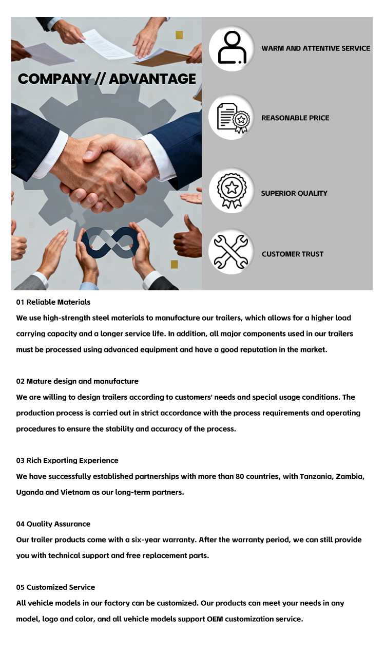 รถพ่วงมาพร้อมกับการกำหนดค่าระดับสูงสุดอย่างครบครัน: ยาง 12R22.5 ช่วยให้มั่นใจในการยึดเกาะที่มั่นคงและความทนทาน ปรับให้เข้ากับสภาพถนนที่ซับซ้อน อุปกรณ์ลงจอดมาตรฐานขนาด 28 ตันให้การสนับสนุนที่แข็งแกร่งสำหรับการดำเนินการขนถ่ายอย่างปลอดภัย หมุดคิง JOST ขนาด 2 นิ้ว (50 มม.) หรือ 3.5 นิ้ว (90 มม.) ซึ่งเป็นอุปกรณ์เสริมให้การเชื่อมต่อที่เชื่อถือได้และความเข้ากันได้กับรถแทรกเตอร์ทั่วไป ระบบกันสะเทือนผสมผสานสปริงเชิงกลเข้ากับระบบกันสะเทือนแบบถุงลม ให้การดูดซับแรงกระแทกที่ยอดเยี่ยม เพื่อลดความเสียหายจากการกระแทกต่อวัสดุก่อสร้างระหว่างการขนส่ง และรับประกันความสมบูรณ์ของสินค้า