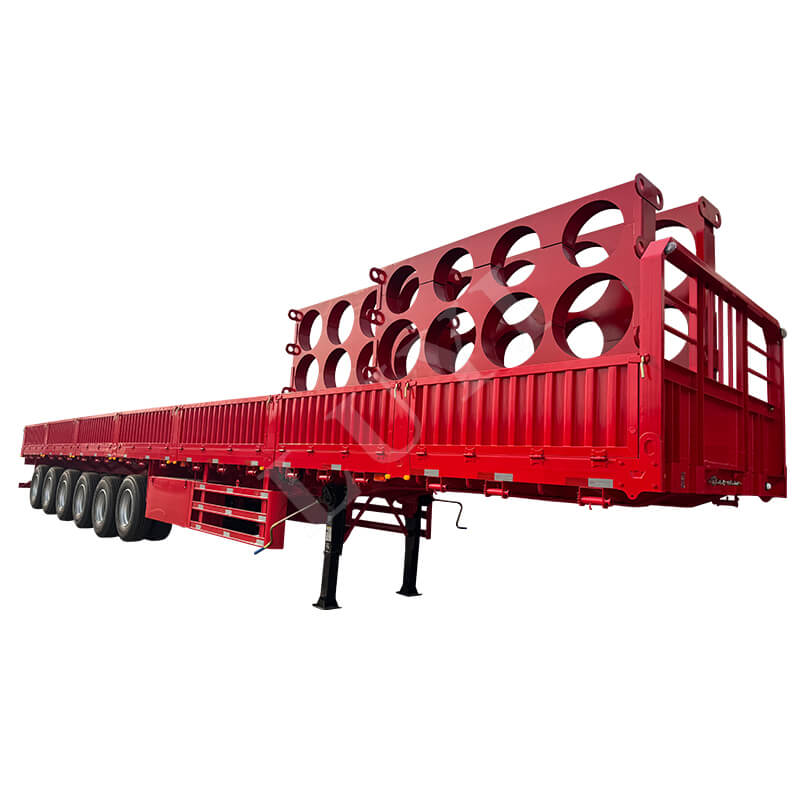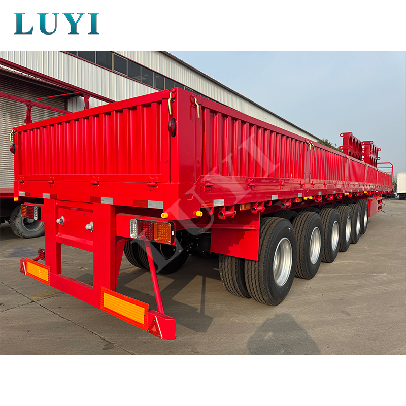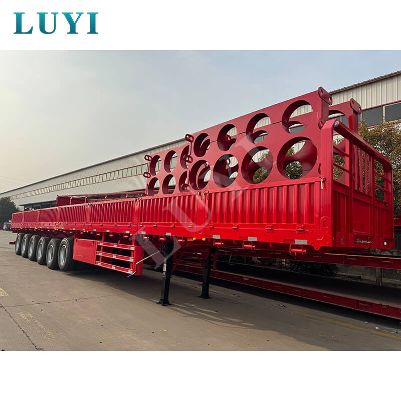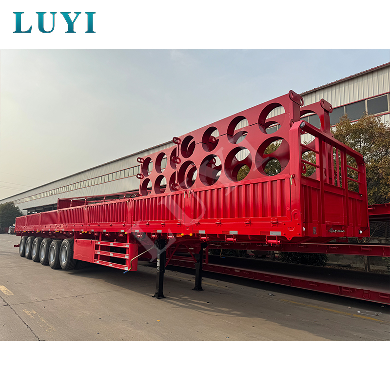 LUYI 6-Axle 15.5m 80-100 Ton 40ft Side Wall Semi-Trailer หรือที่เรียกว่ารถกึ่งพ่วงแบบเสาเข็ม / รถกึ่งพ่วงพื้นเรียบมีต้นกำเนิดจากมณฑลซานตงประเทศจีน เป็นรถกึ่งพ่วงคุณภาพสูงที่ออกแบบมาเพื่อขนส่งตู้คอนเทนเนอร์และสินค้าเทกอง ทำจากเหล็กทั้งหมด มีขนาด 15500x2500x1600 มม. และมีน้ำหนักบรรทุกสูงสุด 60-100 ตัน มีความสามารถในการรับน้ำหนักที่แข็งแกร่งเพื่อตอบสนองความต้องการในการขนส่งสินค้าหนักได้อย่างง่ายดาย