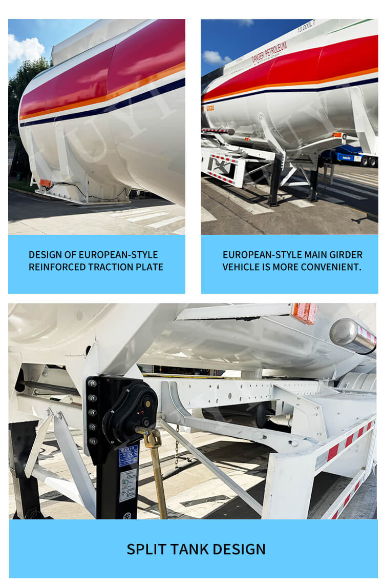 รถกึ่งพ่วงถังน้ำมันเชื้อเพลิง LUYI 3 ถัง 43,000 ลิตรที่ผลิตในซานตงประเทศจีนเป็นอุปกรณ์ขนส่งน้ำมันใหม่ล่าสุดระดับมืออาชีพ ตัวเครื่องทำจากเหล็กขนาด 1085025003800 มม. การออกแบบถัง 3 ถังช่วยให้สามารถบรรทุกผลิตภัณฑ์น้ำมันแบบจำแนกประเภทได้ และความจุขนาดใหญ่ 43,000 ลิตร รวมกับน้ำหนักบรรทุกสูงสุด 20,001-25,000 กิโลกรัม ตอบสนองความต้องการในการขนส่งน้ำมันอย่างมีประสิทธิภาพ