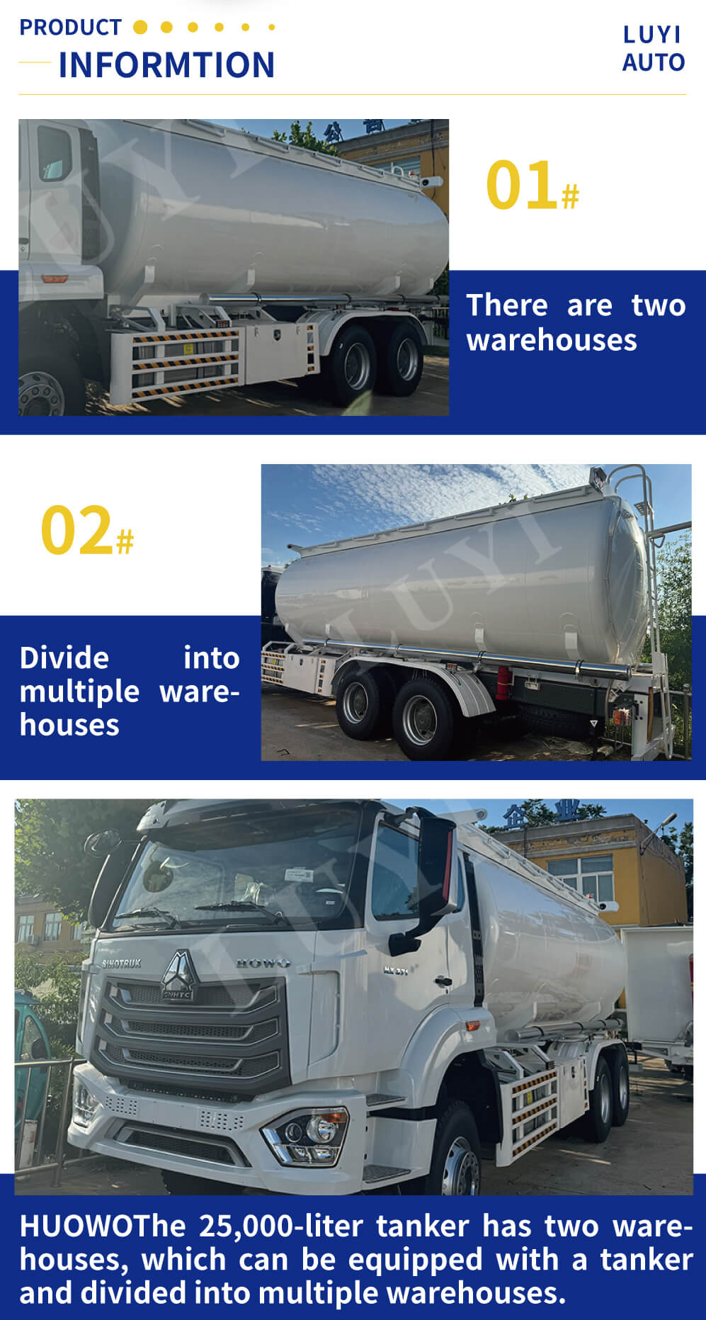 รถกึ่งพ่วงถังน้ำมันนี้มาจากมณฑลซานตง ประเทศจีน และเป็นของแบรนด์ Sinotruk Howo NX ออกแบบมาเป็นพิเศษสำหรับการขนส่งน้ำมัน ยานพาหนะนี้มีรูปแบบการขับเคลื่อน 6×4 โดยมีน้ำหนักรวม ≥30 ตัน และความสามารถในการบรรทุก 31-40 ตัน ปริมาตรถังอยู่ที่ 25,000 ลิตร ซึ่งสามารถตอบสนองความต้องการขนส่งน้ำมันขนาดใหญ่ได้อย่างมีประสิทธิภาพ
