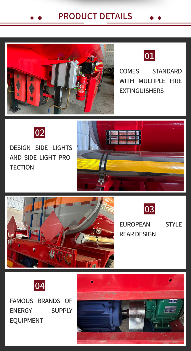 รถกึ่งพ่วงถังน้ำมันที่ปรับแต่งได้ขนาด 30-45 ลูกบาศก์เมตรเป็นยานพาหนะขนส่งเฉพาะที่ออกแบบมาสำหรับน้ำมันเหลว เช่น ดีเซล น้ำมันเบนซิน และน้ำมันหล่อลื่น ด้วยความสามารถในการรับน้ำหนักที่สอดคล้องกัน 21-31.5 ตัน (อิงตามความหนาแน่นของน้ำมันดีเซล 0.7 ตัน/ลูกบาศก์เมตร) ทำให้เหมาะกับสถานการณ์ด้านลอจิสติกส์กระแส......