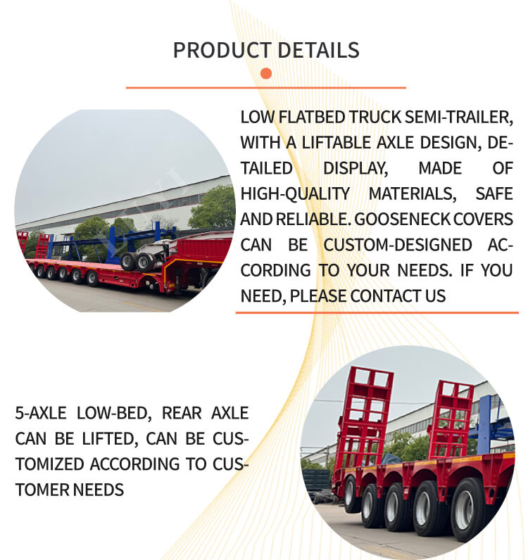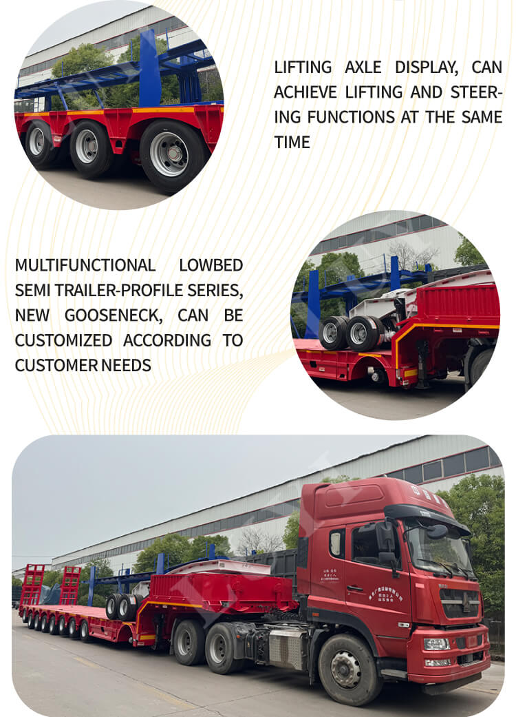 LUYI 8-Axle 120T Air Suspension Low-Bed Semi-Trailer มีต้นกำเนิดจากมณฑลซานตง ประเทศจีน เป็นรถกึ่งพ่วงประสิทธิภาพสูงออกแบบมาเป็นพิเศษสำหรับการขนส่งอุปกรณ์งานหนัก ทำจากเหล็กคุณภาพสูง มีขนาด 22000×3000×1600 มม. พร้อมน้ำหนักบรรทุกสูงสุด 100T ตอบสนองความต้องการในการขนส่งของเครื่องจักรกลหนักต่างๆ ได้อย่างง่ายดาย