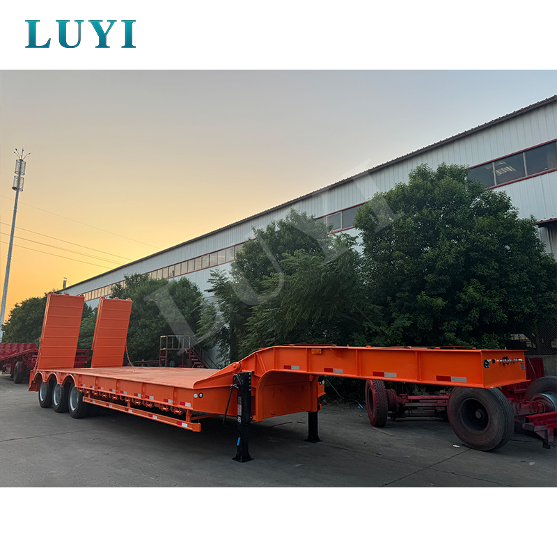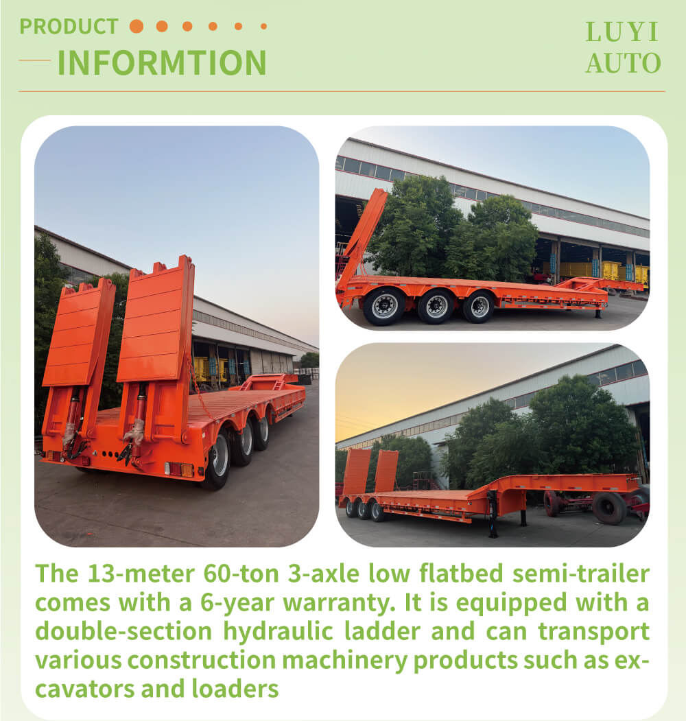 LUYI 3-Axle 60-Ton Detachable Gooseneck Lowbed Semi-Trailer ผลิตในซานตง ประเทศจีน เป็นรถพ่วงขนส่งสินค้าระดับมืออาชีพ ตัวเครื่องทำจากเหล็กความแข็งแรงสูง โดยมีขนาด 1700030001500 มม. โครงสร้างมีความทนทานและพื้นที่เพียงพอ ช่วยให้บรรทุกสินค้าหนักได้อย่างมั่นคง และปรับให้เข้ากับการดำเนินการลากจูงของรถบรรทุกต่างๆ